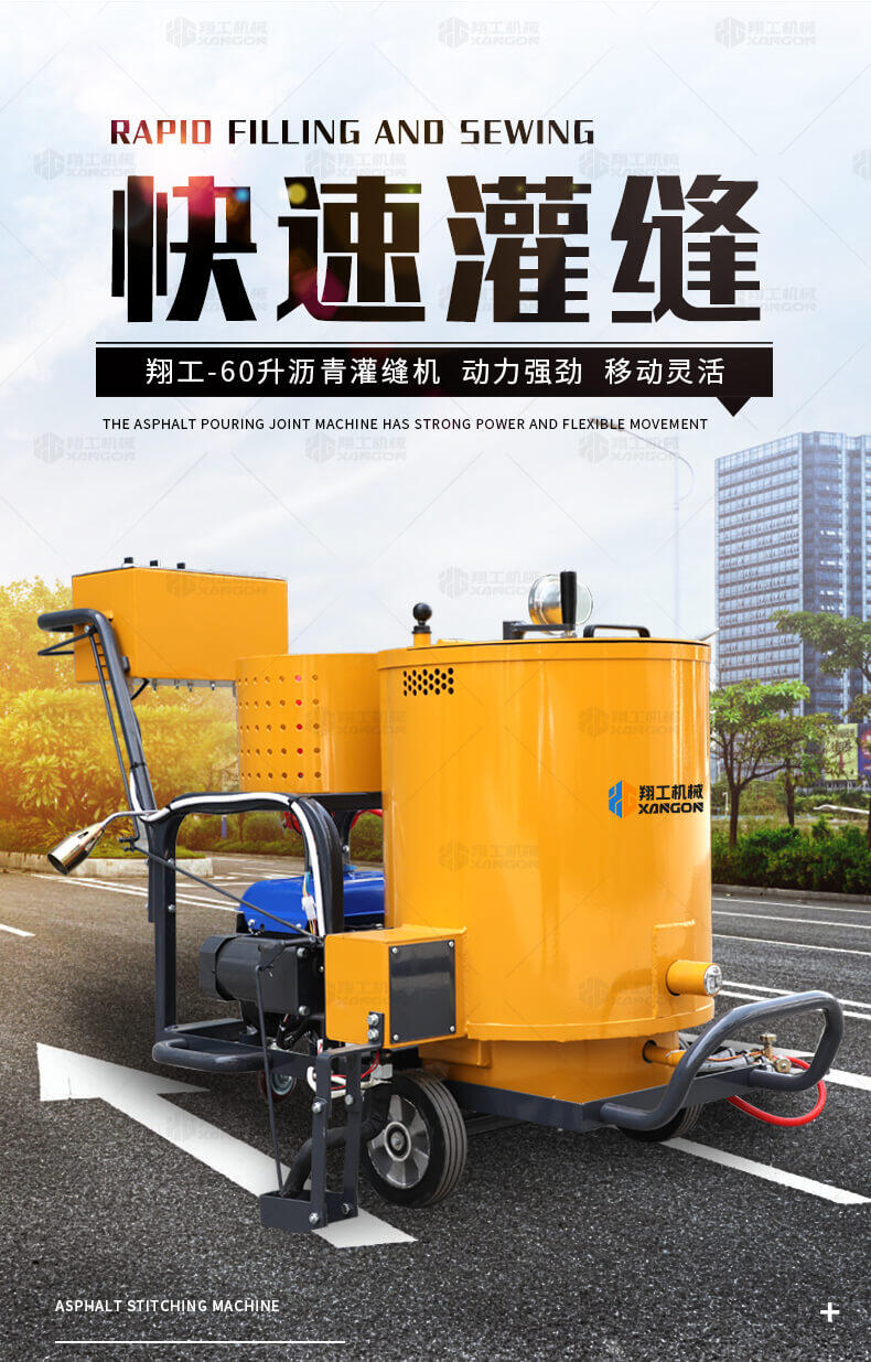 60升沥青灌缝机用于沥青或水泥路面裂缝沥青灌缝。 60升沥青灌缝机采用名优发电机,性能稳定;液化气加热,方便灵活;超大沥青罐;出料管路全程加热,避免堵塞。