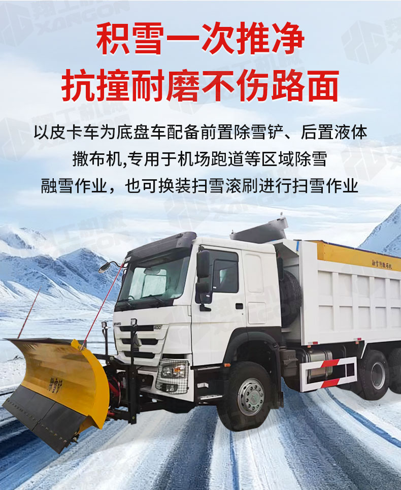 用途以皮卡车为底盘车配备前置除雪铲、后置液体撒布机,专用于机场跑道等区域除雪融雪作业,也可换装扫雪滚刷进行扫雪作业。