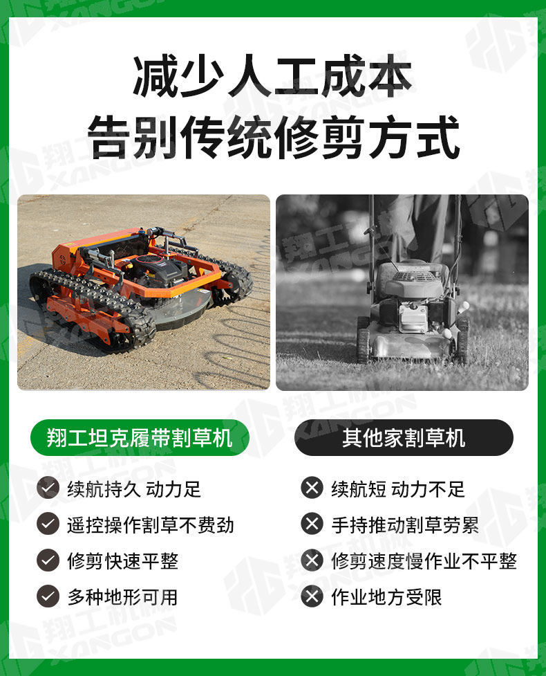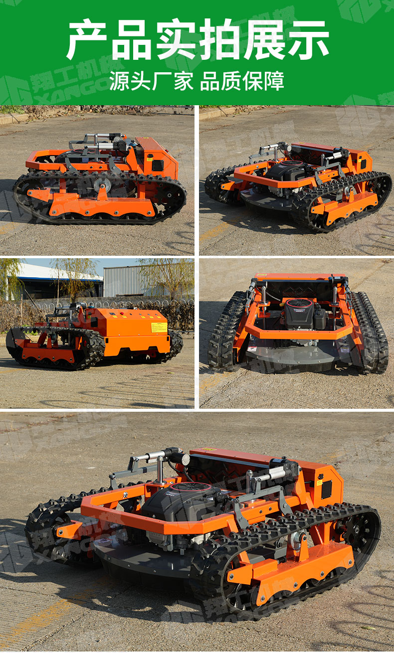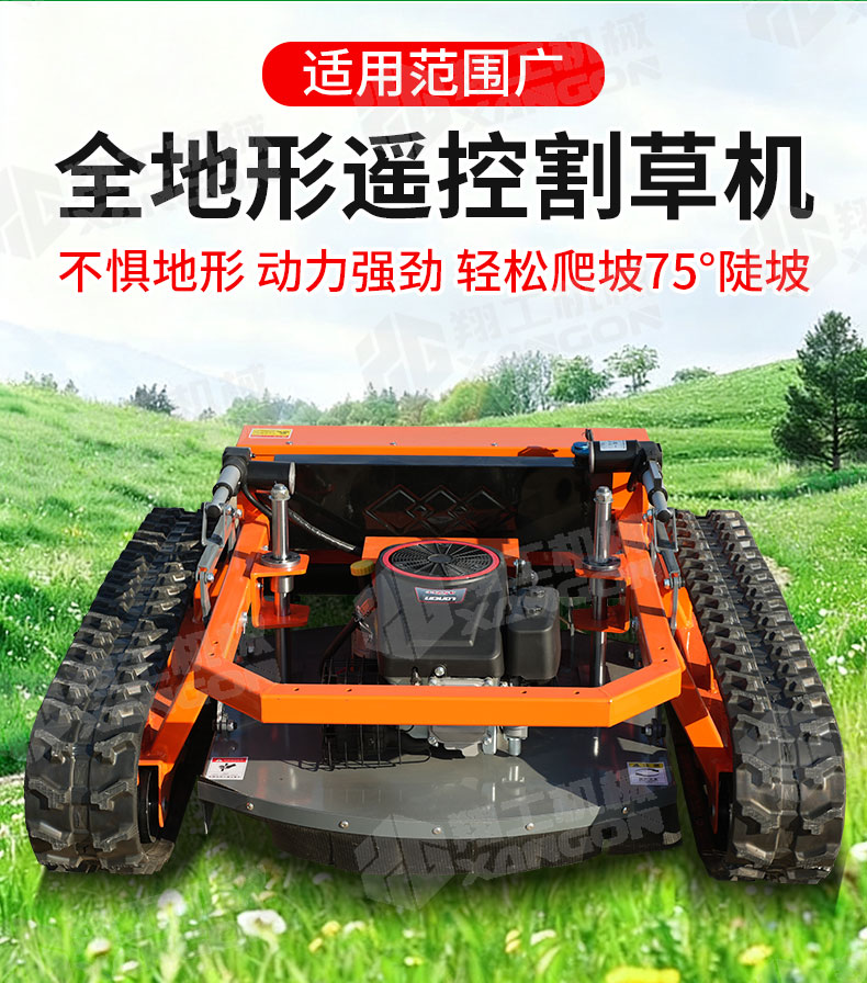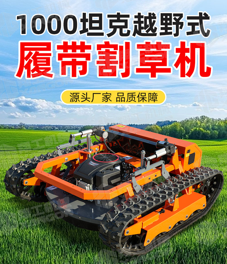 这是一款颠覆传统的遥控坦克割草机。它采用坚固的履带底盘,轻松征服陡坡、湿滑草地等复杂地形。无线遥控操作,让您远离烈日与噪音,在树荫下即可精准完成修剪。动力强劲,效率远超传统手推式,是打理大型或不平整土地的理想智能工具。