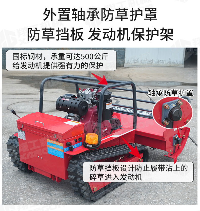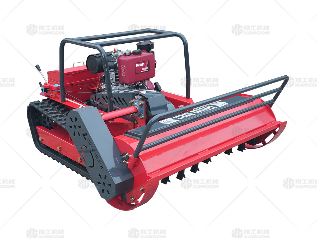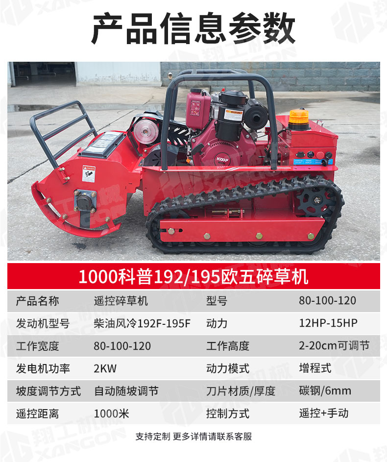 本款柴油遥控割草机是一款动力强劲、专为恶劣工况设计的大型专业设备。它采用高性能柴油发动机,扭矩大,续航持久,能轻松应对陡坡、湿地等复杂地形。先进的无线遥控技术确保了操作人员的安全,实现了远距离高效、精准割草。特别适用于园林绿化、堤坝养护、机场周边等大面积和危险区域的除草作业。