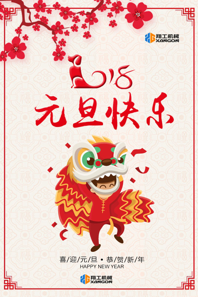 在此,山东翔工机械祝您元旦快乐,阖家幸福!愿您狗年大吉大利,万事如意!2018!我们携手并进,共赢狗年!再创新辉煌
