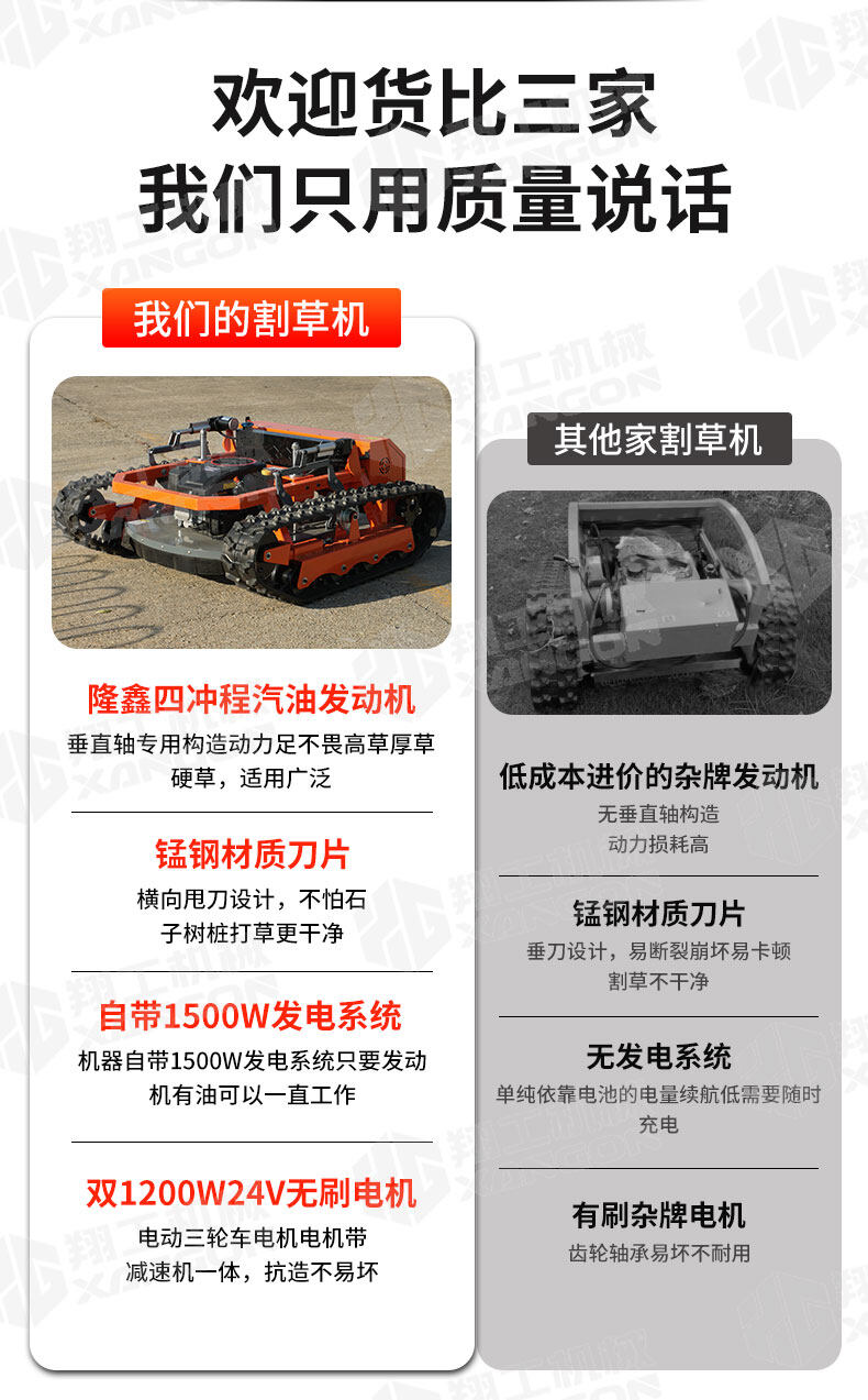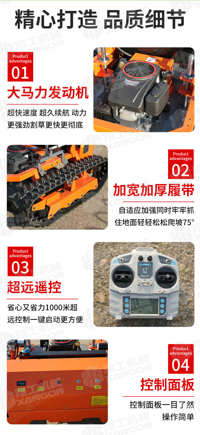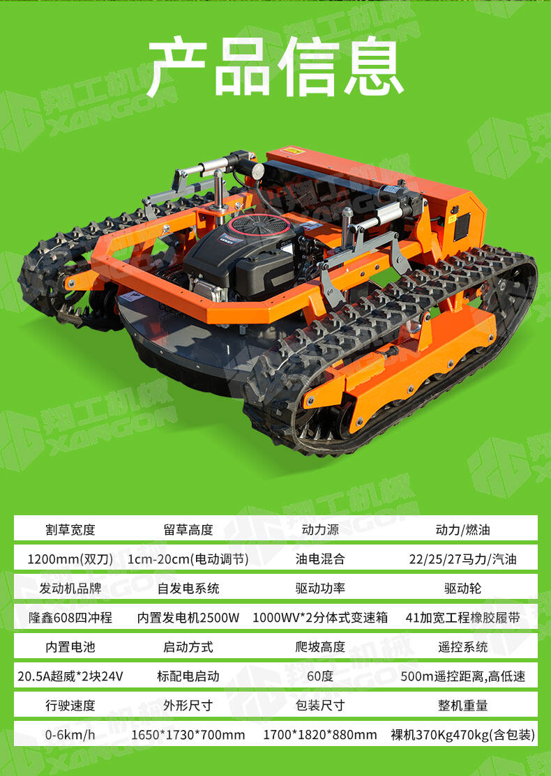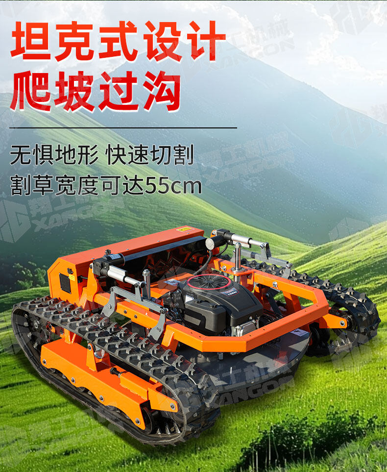 XG-1200是一款革新性的遥控坦克割草机,专为复杂地形设计。其独特的橡胶履带底盘,具备卓越的越野与爬坡能力,轻松应对陡坡、湿滑及不平整草坪。无线遥控操作,灵活精准,极大提升了割草效率与安全性,是果园、荒地及专业园艺工作的理想之选。