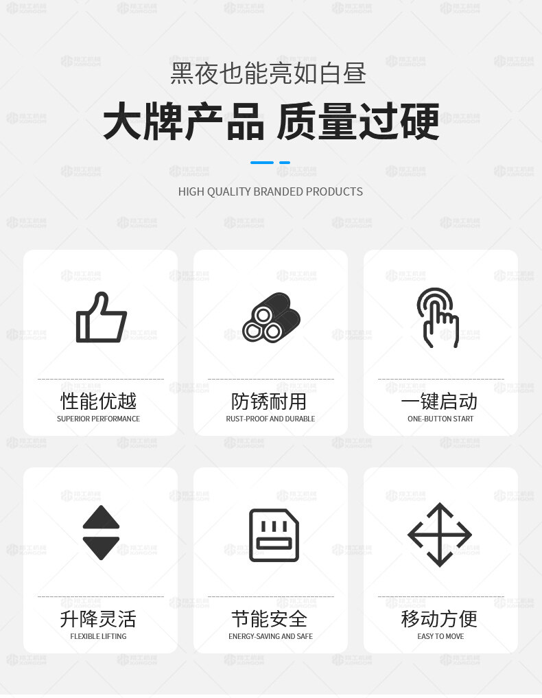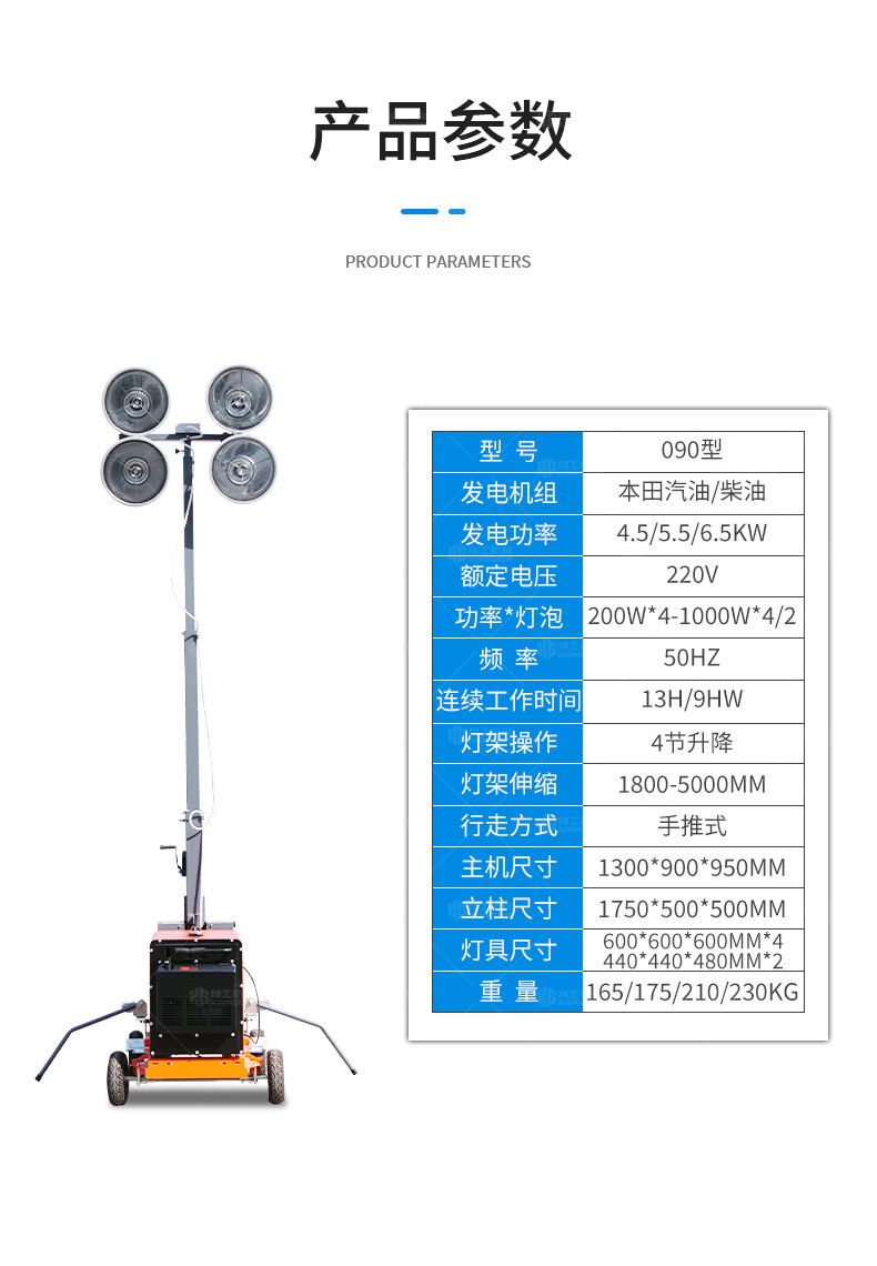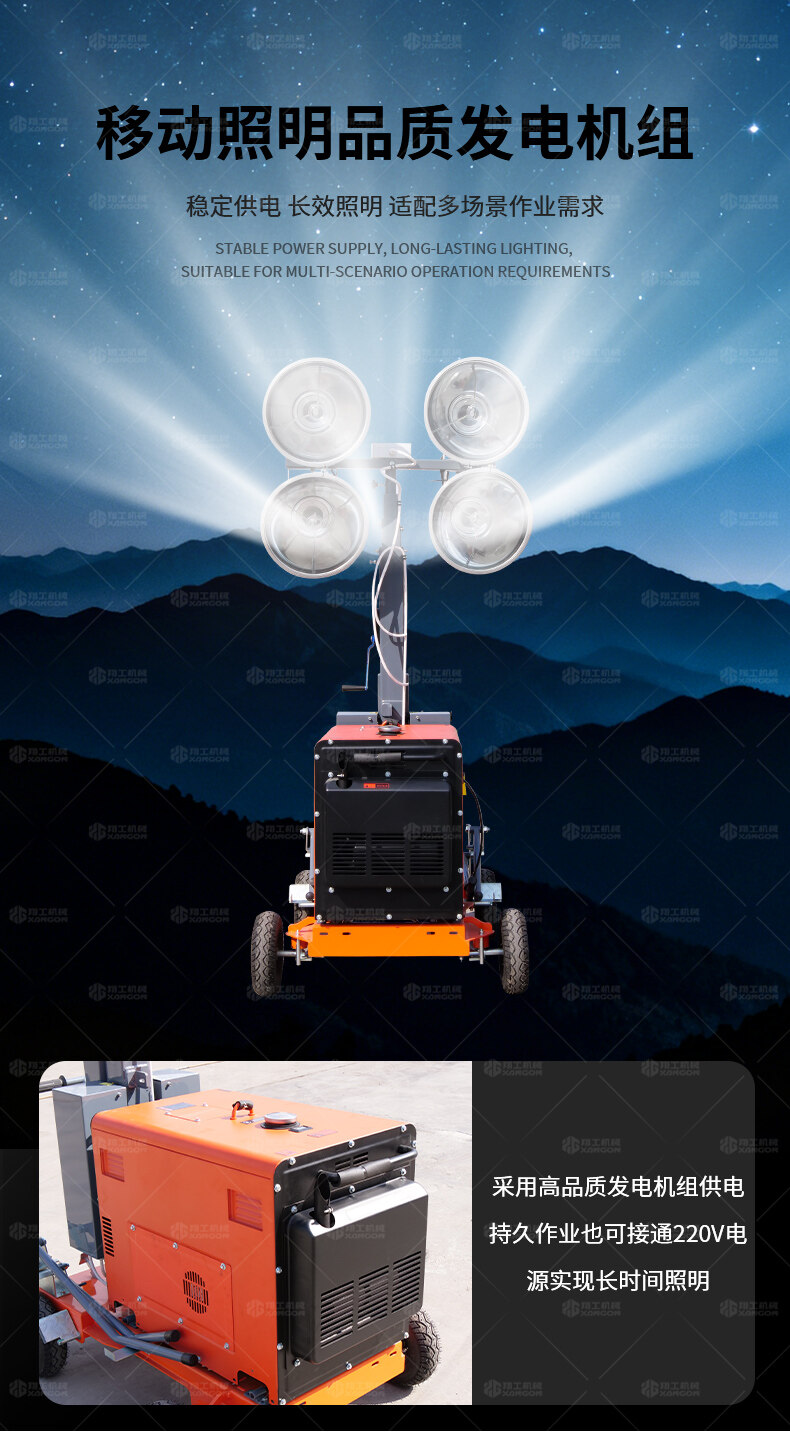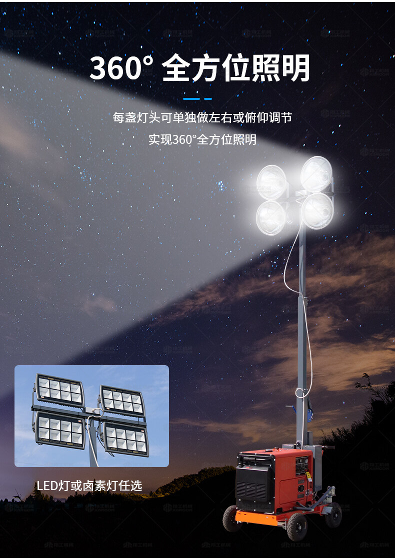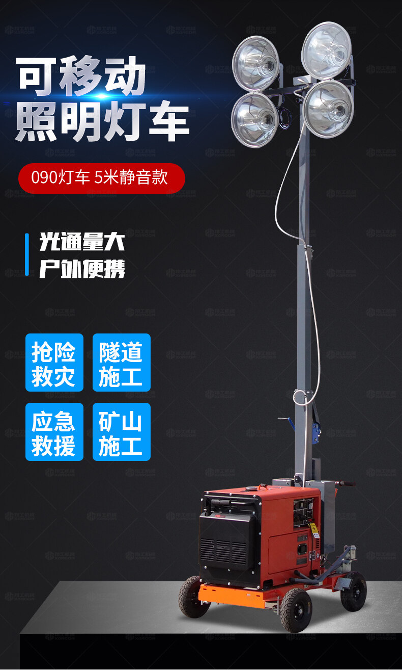 本款灯车采用5米升降杆,静音发电机,照明覆盖广且运行噪音极低。具备移动灵活、一键升降、防水防尘等特点,续航持久。专为对噪音敏感的场景设计,如夜间市政施工、室内场馆作业、应急抢险及大型活动保障,是实现高效、环保照明的理想解决方案。